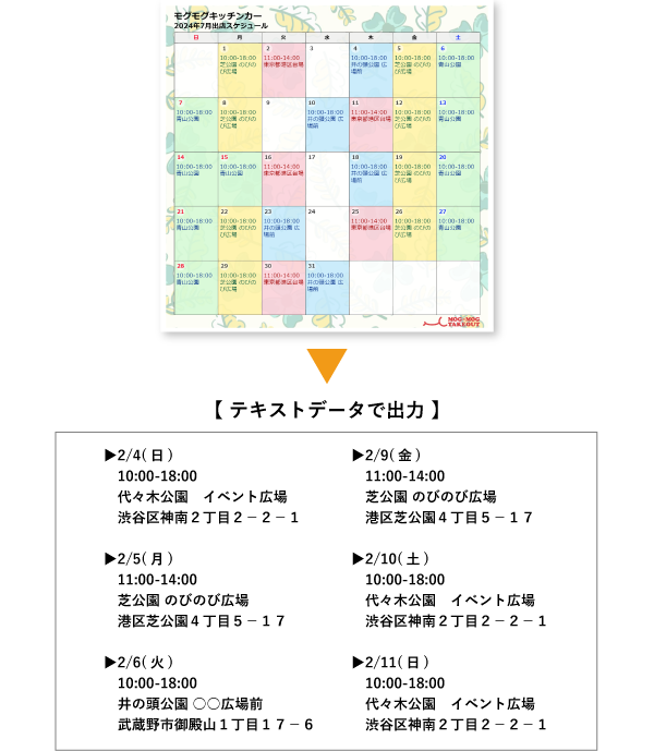 カレンダーに設定されたスケジュール情報をテキストに出力することが可能です。SNS等で、テキストベースで予定を広報する場合などに便利な機能です。